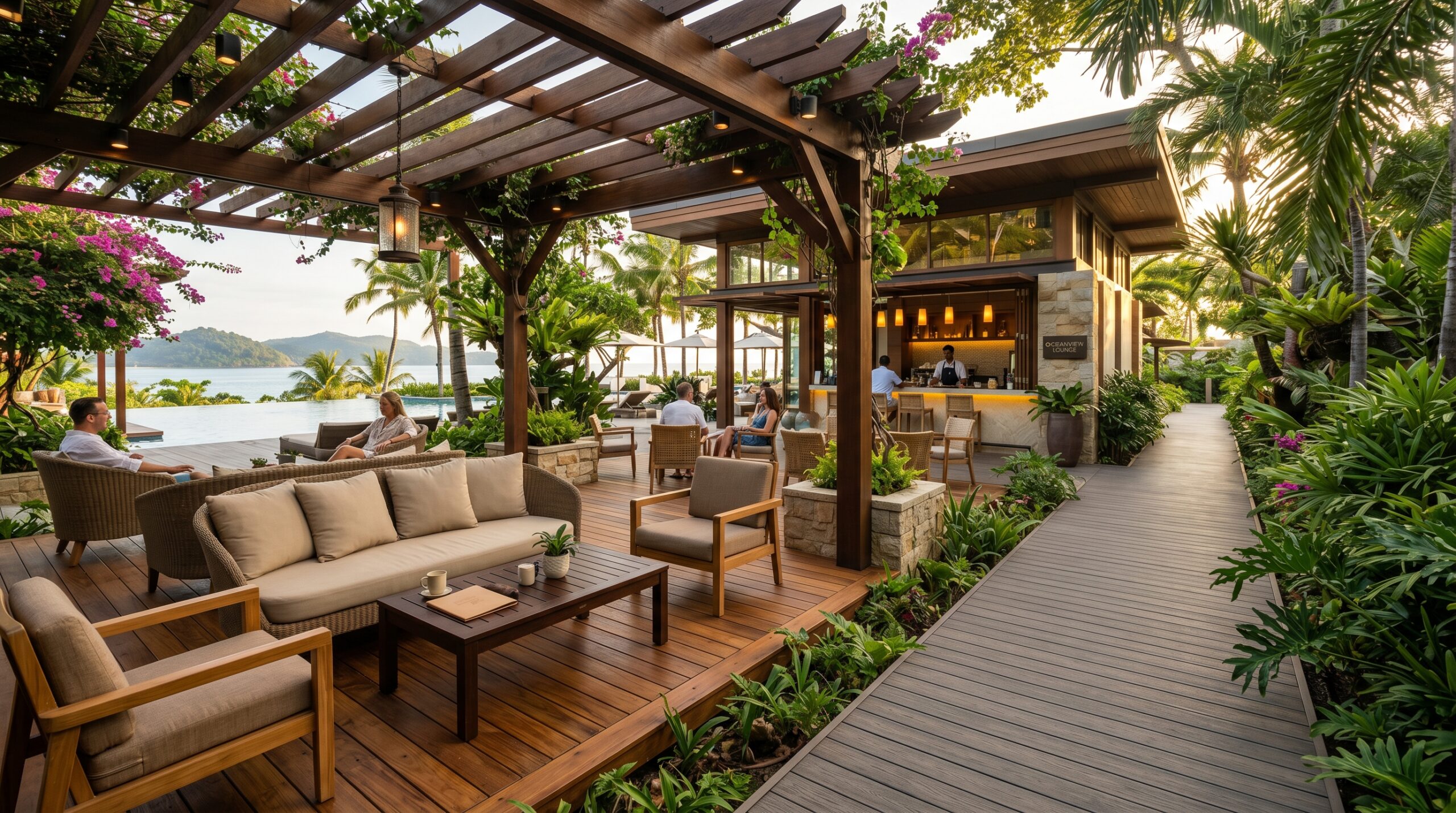 Một không gian ngoại thất đẹp không chỉ là nơi thư giãn mà còn là công cụ marketing hiệu quả. Khi khách hàng bước lên khu vực sàn gỗ ngoài trời, họ ngay lập tức cảm nhận được sự đầu tư chỉn chu và chuyên nghiệp.